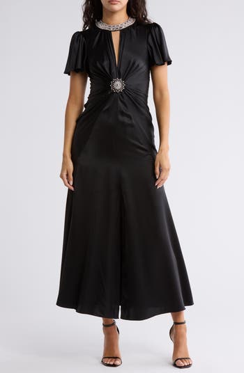 Show off Old Hollywood glamour in this fluid silk maxi dress fashioned with an elegantly gathered bodice framed by a bejeweled neckline and sparkling brooch.