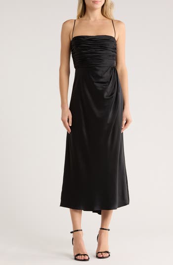 Make an elegant appearance in this smooth silk midi dress fashioned with a ruched bodice and flowy back sash for vintage-inspired glamour.