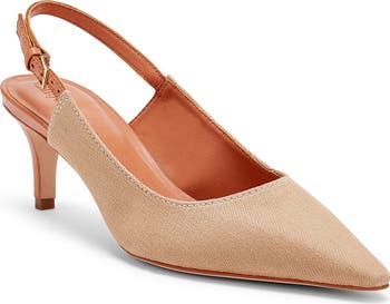 Light denim provides a breezy update for a pointy-toe pump complete with a slingback strap and cushy, arch-supporting footbed.