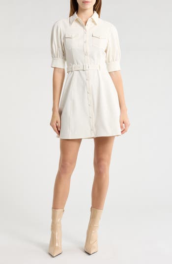 Maintain a crisp, classic look with this structured shirtdress featuring puff sleeves, a point collar and a matching belt.