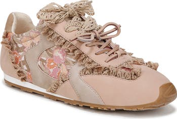 Victorian-inspired touches of ruffled trim and floral-lace panels bring unexpected romance to the traditional runner silhouette of this streamlined sneaker.