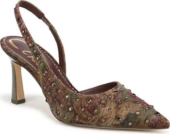 Sparkling crystals and studs dazzle atop a pointy-toe pump complete with a graceful slingback strap.