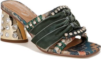 Sparkling crystals and knotted ribbons create an elegant design on this delightful block-heel sandal.