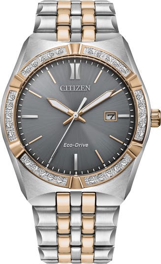 A striking two-tone finish distinguishes a polished timepiece enhanced with bright-white diamonds in the bezel and a sunray dial.