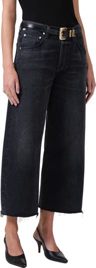 Switch it up on denim day with sturdy nonstretch jeans sporting a high waist, a baggy fit and cropped, fraying hems that relax the look.