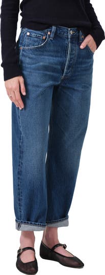 Meant to be worn low on the waist, these slouchy, vintage-inspired nonstretch jeans flaunt bow legs that taper to the ankles and end in uneven cuffs.