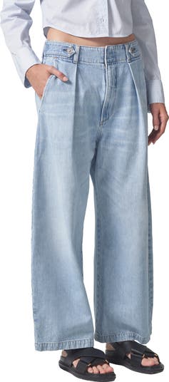 Make a statement in these pleated nonstretch jeans fashioned with trouser-style details and wide legs that sway with every step.