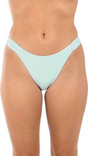 Shirring texturizes the side tabs of hipster-styled bikini bottoms that are featured in an iridescent hue so you can reflect the glow of the sun as you lounge poolside.