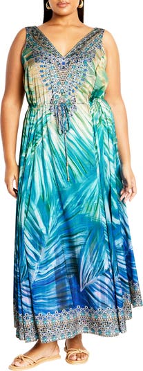 Tropical foliage overlaid with a print of cascading bejeweled necklaces brings resort-ready glamour to a sweeping maxi dress cut from superstretchy jersey.
