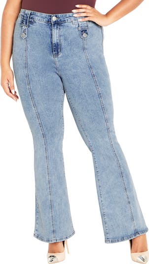 Button tabs with gleaming hardware accent the high-waisted silhouette of comfortable bootcut jeans cut from shape-retaining stretch denim.