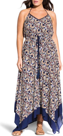Be the essence of boho in this breezy, halter-style maxi cut with a solid-border handkerchief hem and a tasseled tie at the waist.