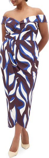Tucked pleats texture and shape this shoulder-baring midi covered in a bold swirling print and finished with a high/low tulip hem.