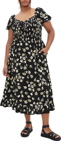Bright flowers pattern a flowy midi dress in an easygoing silhouette with a smocked bodice and softly puffed short sleeves.