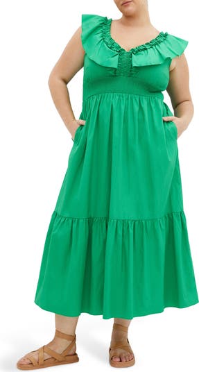 Filly ruffles trace the neckline of a day-to-night maxi dress designed with a fitted waist and billowy tiered skirt.