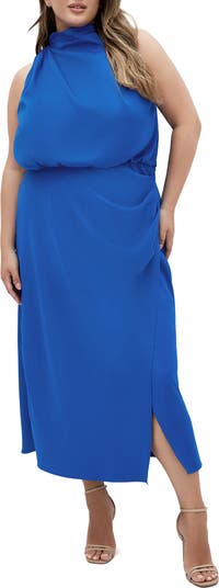 An asymmetric cut enhances the casually elegant drape of this midi styled with high halter neck and a faux-wrap skirt.