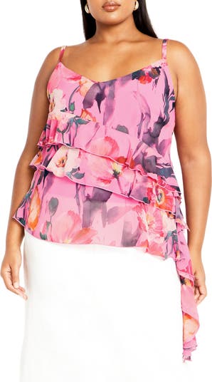 Flounces in an asymmetric tiered design lend plenty of romance to a sweet camisole completed by a trailing ruffle.