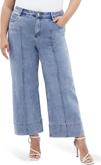 Bring contemporary style to your look with cropped jeans featuring a wide-leg silhouette with a raised front seam and wide hem.
