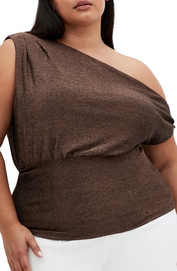 A shimmery top offers night-out appeal with a curve-hugging silhouette accented by a striking one-shoulder neckline.