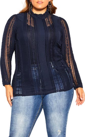 Sheer lace panels enhance the contemporary allure of this romantic long-sleeve top.