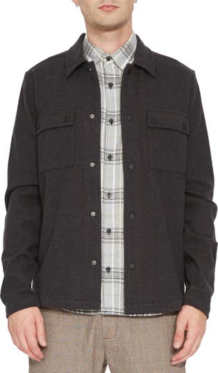 A snap-button placket offers easy layering in a jacket topped with flap pockets for utilitarian appeal.