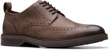 Brogue perforations and wingtip styling lend timeless sophistication to a leather derby grounded by a cushioned footbed for lasting comfort.