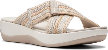 A lightweight design and contoured cushioning offers signature comfort to a crisscross slide sandal fitted with an adjustable strap for all-day comfort.
