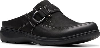 A moc-stitched toe and buckled strap define this easy-on clog grounded on a lightweight, shock-absorbing sole.
