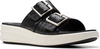 A hearty wedge and cushioned footbed balance style and comfort in this double-strap slide sandal with adjustable buckles for a customized fit.
