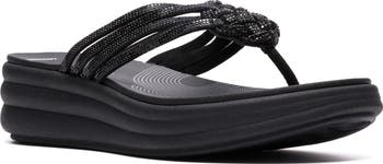 Bring subtle sparkle to your warm-weather looks with this flip flop sandal designed with a crystal-embellished twisted strap and balanced upon a wedge heel.