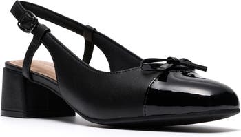 A patent cap toe brings glossy shine to this leather pump fitted with a supportive Ultimate Comfort foam footbed and balanced upon a sturdy block heel.