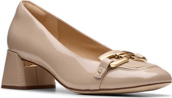 Commute in style with this chic patent-leather pump featuring gleaming bit hardware, arch-supportive cushioning and a boxy block heel.