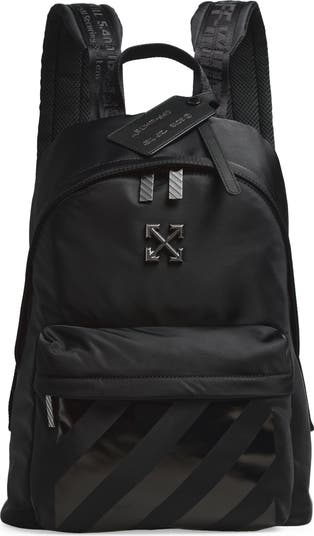 Multidirectional-arrow hardware and a leather luggage tag looped around the top handle put house-signature touches on this sleek, lightweight backpack designed in a domed silhouette.