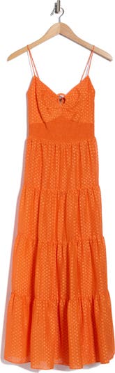 Fashioned from a sheer checked jacquard in a fruity hue, this lovely tiered sundress features a ring-cinched bodice and smocked yoke, all tethered by dainty spaghetti straps.