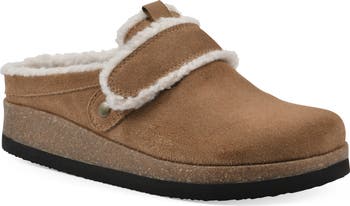 A signature cushioned footbed supports your stride in casual slip-on clog featuring a buckled strap and cozy faux shearling lining.