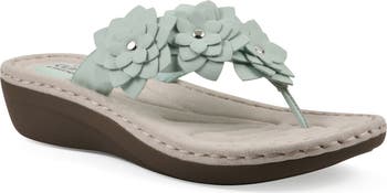 Dimensional flowers trace the straps of a thong-toe sandal constructed with a comfortably cushioned footbed and low wedge heel.