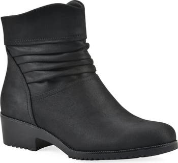A modest block heel brings cushioning and a sensible lift to an ankle-height boot with a casual scrunched shaft.