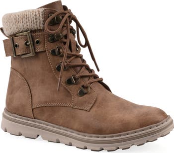 A cozy knit collar adds padded warmth to a lace-up boot designed with rugged traction lugs at the sole and a side zipper for easy entry.