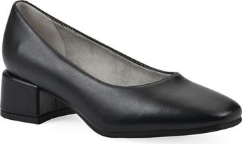 A well-cushioned footbed supports your stride in a classic pump refined by a wrapped block heel and squared off toe.
