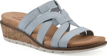 Snakeskin-embossed straps elevate a beachy slide sandal featuring a faux cork–wrapped wedge heel and a flexible grip sole.
