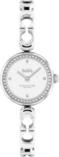 The brand's iconic typeface and horse-drawn carriage bring both readability and instant recognition to this diminutive watch set on a slender logo-link bracelet.