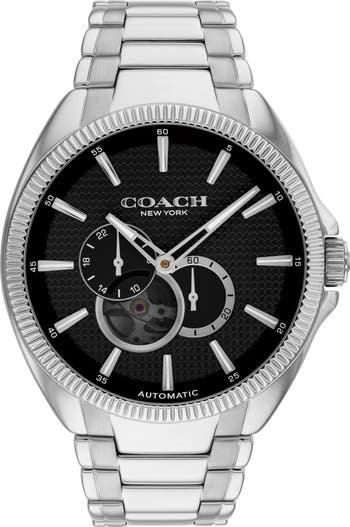 Luminescent stick indexes and bold hands distinguish a automatic watch boasting three sub-eyes and a date window for precise timekeeping.