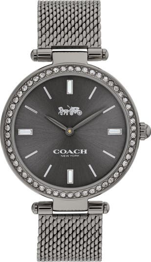 Baguette-cut white crystals mark each quarter hour on the dial of this mesh-strap watch perfect for your everyday style.