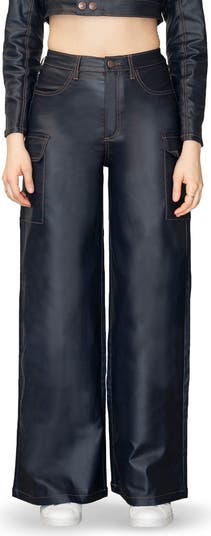 A glossy coating adds flashy style to wide-legged jeans popped with plenty of pocket space.