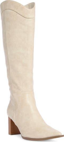 Bring a Western-inspired touch to your cold-weather ensembles with this tall boot balanced upon a stacked block heel and styled with a pointed toe.