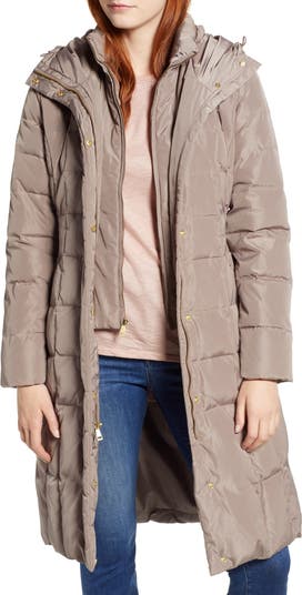 A bib insert topped with a stand collar adds another layer of cozy warmth to a box-quilted coat insulated with down-and-feather fill and topped with a lofty hood. Ruched side panels nip in the waist to add flattering definition to the silhouette.