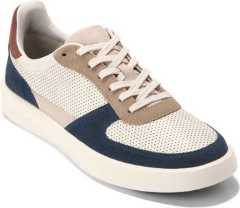 Tiny perforations bring breathable comfort to a low-top lace-up sneaker rendered in smooth leather with sporty suede overlays.