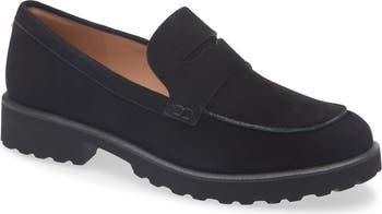 A penny-keeper strap adds a touch of timeless appeal to a classic loafer set on a low stacked heel.