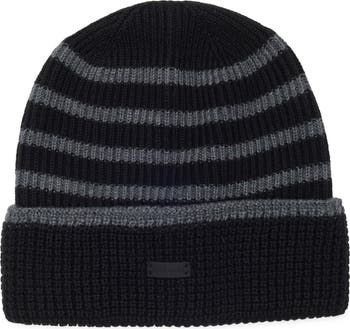 Ringed in classic stripes, this ribbed beanie has a cozy cuff and is branded with a tonal logo patch at the brim.