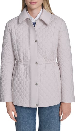 A cinched waist further streamlines the silhouette of a low-profile quilted jacket topped with a smart collar and served with a pair of zipped pockets.