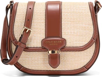 A mix of raffia and grained leather trim bring statement-making style to a saddle bag suspended from a crossbody strap that make it a perfect option for hands-free outings.